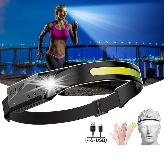 More about this item LED spotlights can illuminate up to 150 feet away. Wave sensor it can meet your use in any scene. Suitable for camping, cycling, night walking, running, climbing, fishing, auto repair, hunting, reading, etc. Rechargeable design LED headlight has five lighting modes COB high mode, COB low mode, XPE high mode, XPE low mode and strobe mode, you can click the switch to change the mode, long press the switch to switch the frequency flash mode